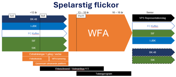 För att komplettera vår spelarstig har WFA ett samarbete med VPS. Samarbetets målsättning är att erbjuda målinriktade/satsande spelare bästa möjliga träningsmiljö och möjlighet att spela matcher och tävla i den ifrågavarande åldersgruppens högsta serienivå i nationella serier. Samtidigt vill föreningarna, genom samarbetet, försäkra att så många lag som möjligt hålls ihop så länge som möjligt. Detta möjliggörs genom att de spelare som vill ha mera utmaningar både kan få mera utmaningar via samarbetet, samtidigt som de kan spela tillsammans med sina kompisar i egen hemmaförening, och på så sätt bidra till att så många som möjligt hålls kvar i fotbollen så länge som möjligt.